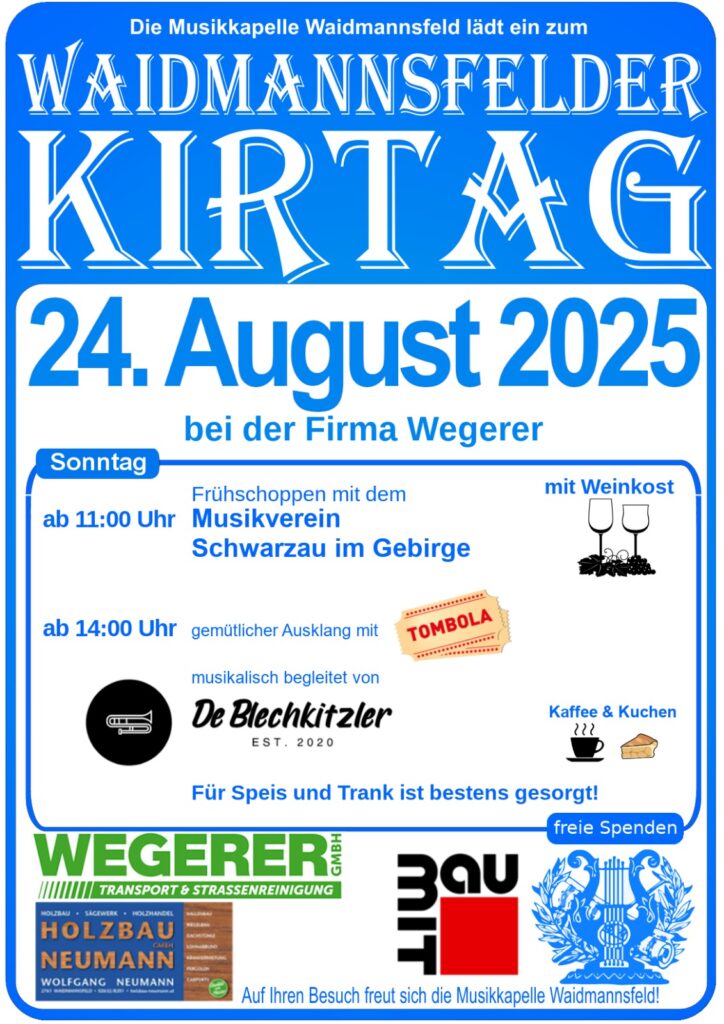 Der traditionelle Kirtag findet heuer wieder in Waidmannsfeld am Gelände der Firma Wegerer Transporte statt.