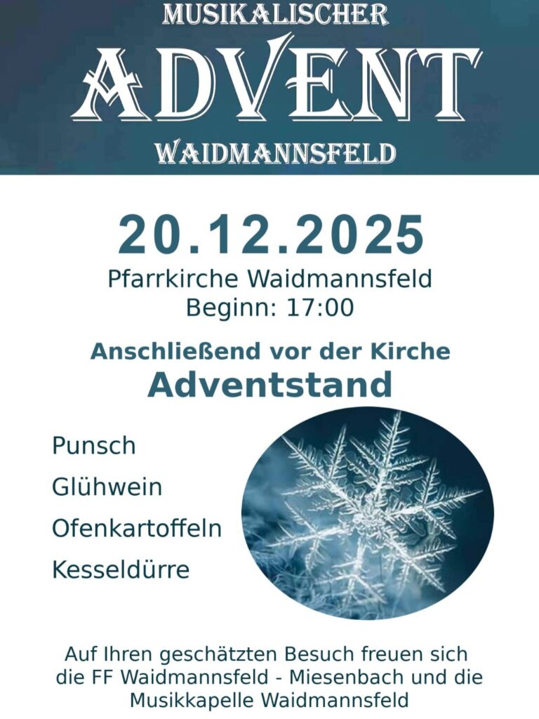 Das Adventkonzert findet am Samstag, 20. Dezember, in der Pfarrkirche Waidmannsfeld statt.