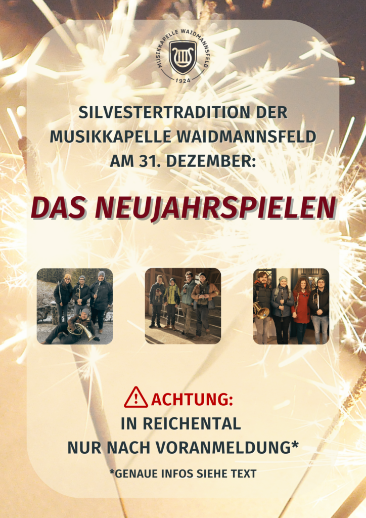 Silvester naht und damit auch das traditionelle Neujahrspielen der Musikkapelle Waidmannsfeld. Wie jedes Jahr werden wir am 31. Dezember wieder in vier Bläsergruppen unterwegs sein und mit dem traditionellen Neujahrslied musikalische Silvester-Grüße von Haus zu Haus bringen.