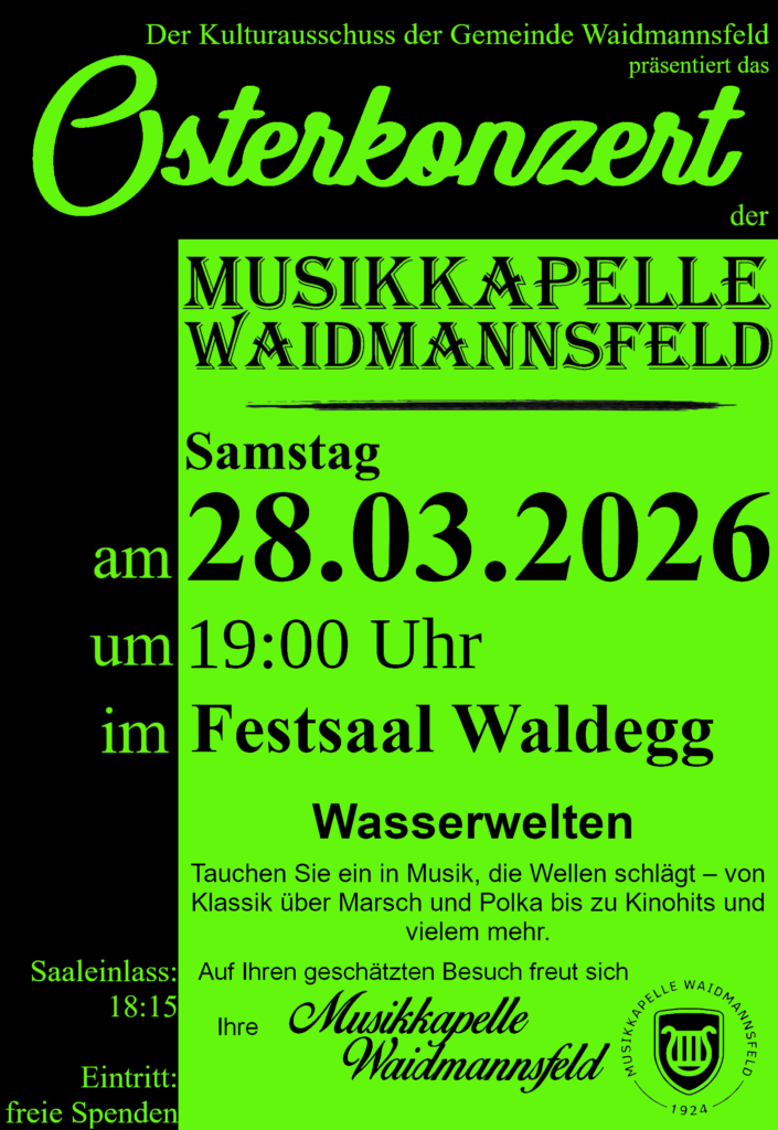 Wir laden alle herzlich zu unserem diesjährigen Osterkonzert ein.Wann? 28.03.2026 19:00 UhrWo? Festsaal Waldegg